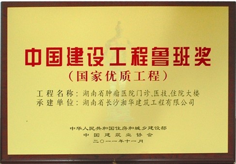 “魯班獎”全稱為“建筑工程魯班獎”,是中國建筑業(yè)工程質(zhì)量的最高榮譽,由建設(shè)部、中國建筑業(yè)協(xié)會頒發(fā)。此次我公司獲獎的“湖南省腫瘤醫(yī)院門診醫(yī)技住院大樓工程” 2007年3月開工,2010年7月竣工驗收,總建筑面積91000 m²,建筑高度60m,工程造價5.14億元。該工程在施工中運用了建筑業(yè)10項新技術(shù),攻克多項技術(shù)難題,采用了200多種節(jié)能環(huán)保材料,施工質(zhì)量精細(xì),造型結(jié)構(gòu)優(yōu)美。投入使用后取得了良好的社會及經(jīng)濟(jì)效益。